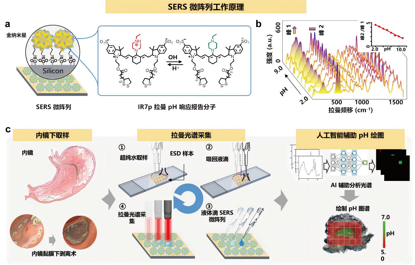 图 1:建立策略病人胃黏膜样本pH 值测量的 SERS阵列,通过黏膜pH分布图定位EGC。