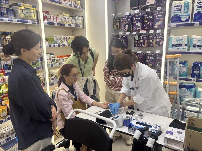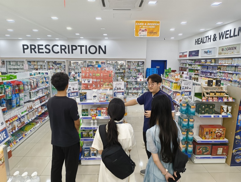 当天下午,学生们走进社区药房双威康乐药剂(Sunway Multicare Pharmacy),实地观摩药品零售、患者咨询及健康管理服务,与驻店药剂师深入交流马来西亚社区药房的运营模式。